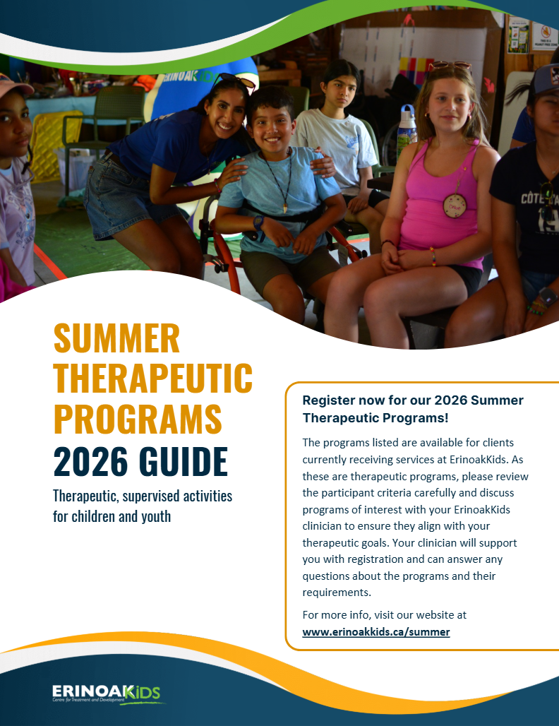 The programs listed are available for clients currently receiving services at ErinoakKids. As these are therapeutic programs, please review the participant criteria carefully and discuss programs of interest with your ErinoakKids clinician to ensure they align with your therapeutic goals. Your clinician will support you with registration and can answer any questions about the programs and their requirements.